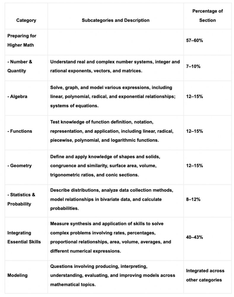 The section reports nine scores: an overall score and eight reporting category scores based on specific mathematical knowledge and skills. The table below summarizes the categories and their approximate percentage of the section.