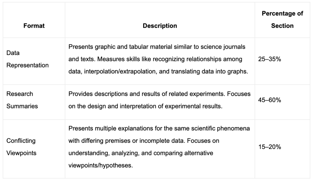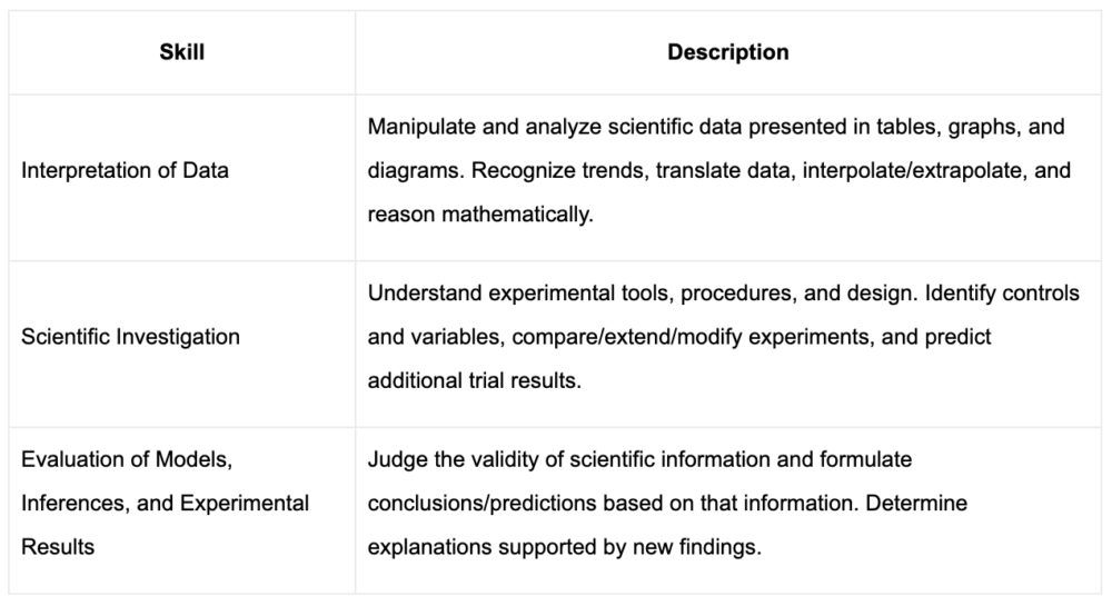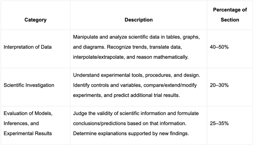 This structure ensures that students can demonstrate their science reasoning and problem-solving skills, which are essential for college-level science courses.