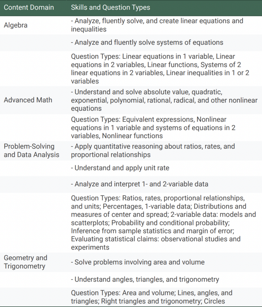 Here is a breakdown of the types of questions and skills assessed in each domain: